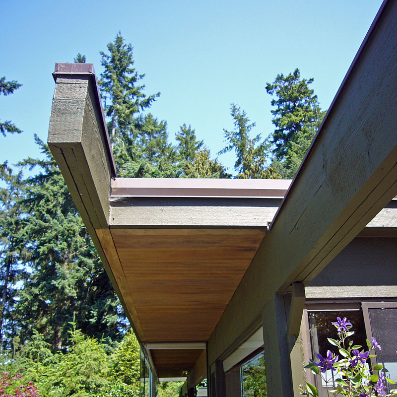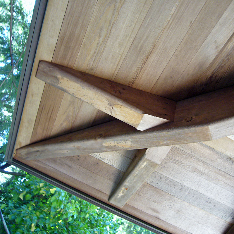 roof eave detail. the roof comes to a sharp point and no gutters were present.