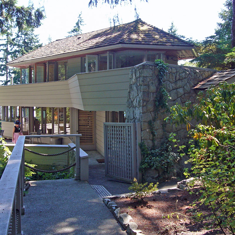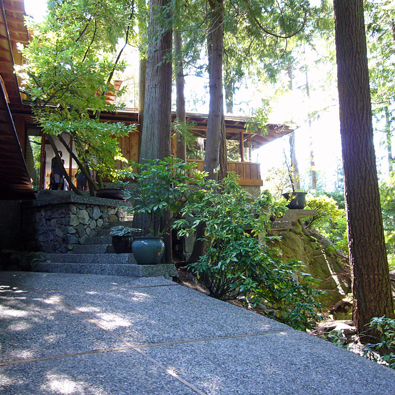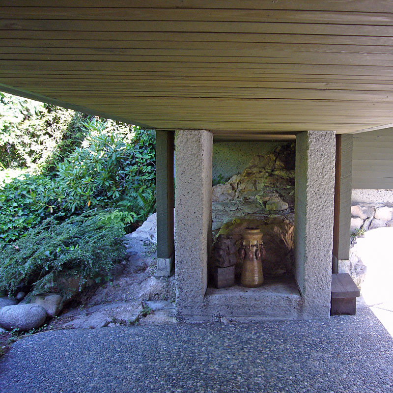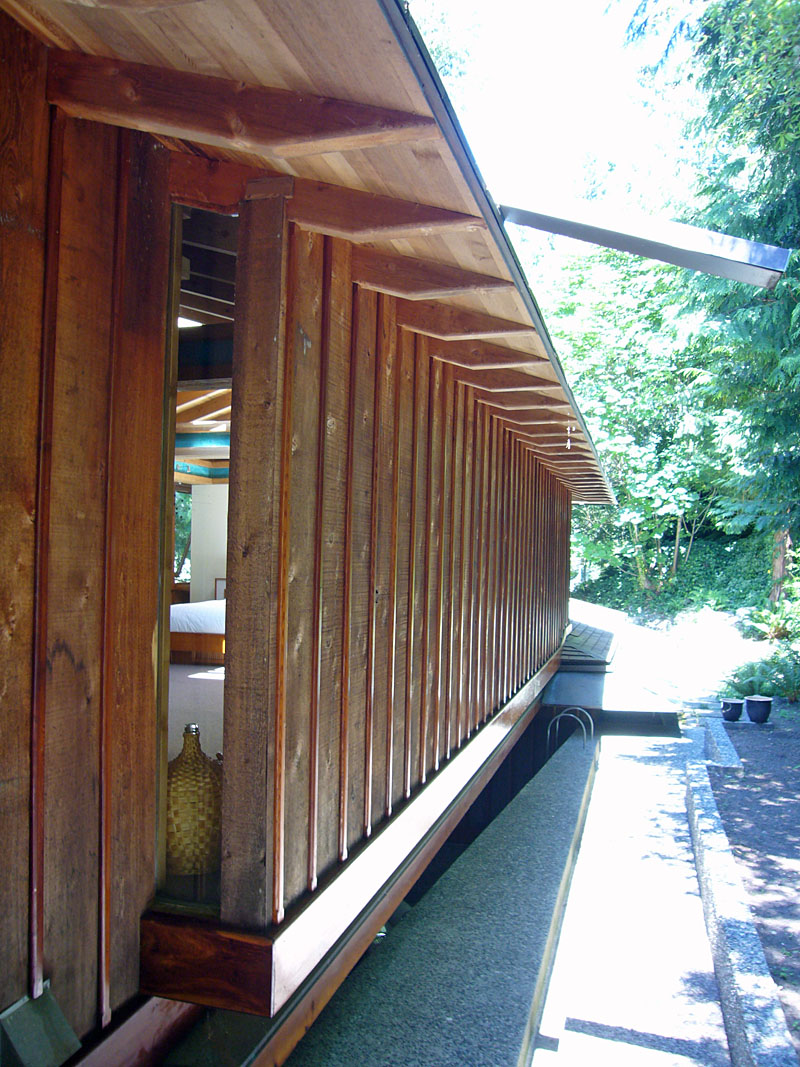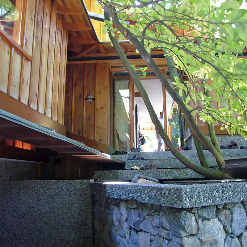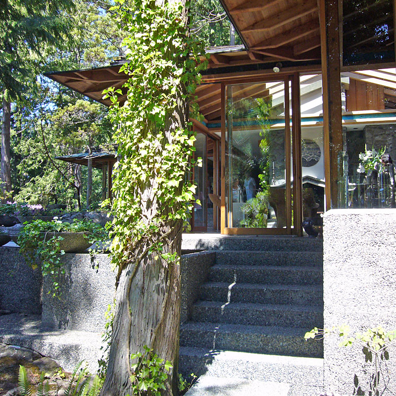 rain forest house, russell hollingsworth, c.1973the approach to the house was a winding road up a steep hill. nestled tightly between old growth cedars is the stone and wood house.