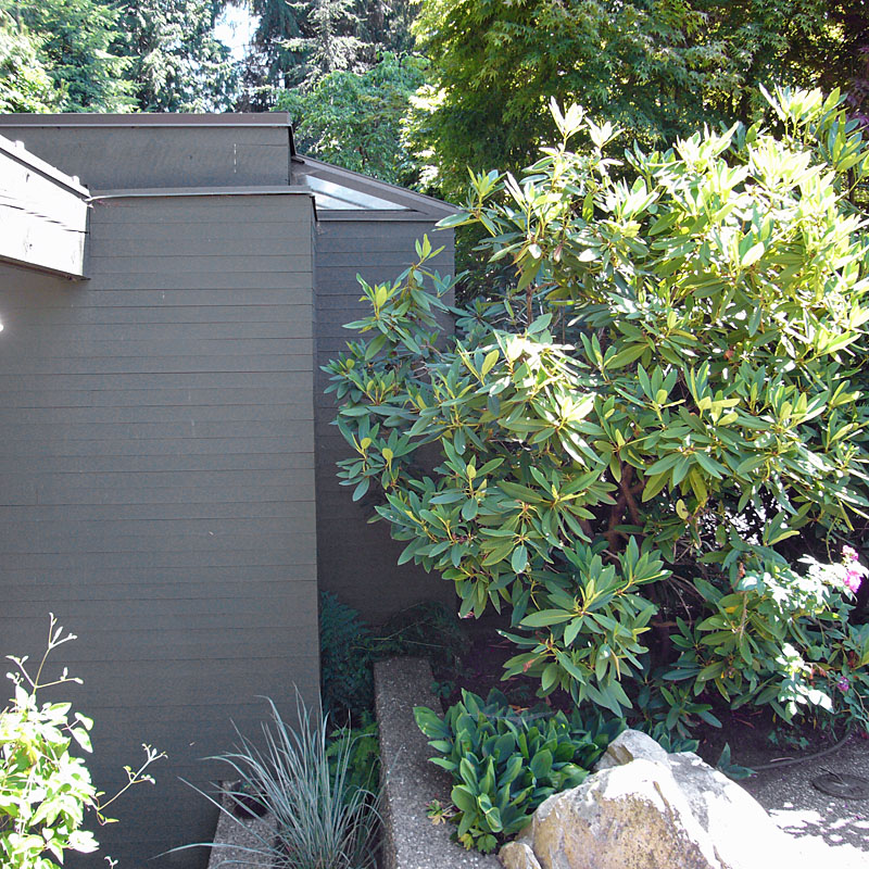 lush landscaping throughout the site. an open carport located under the cantilevered roof to the right.