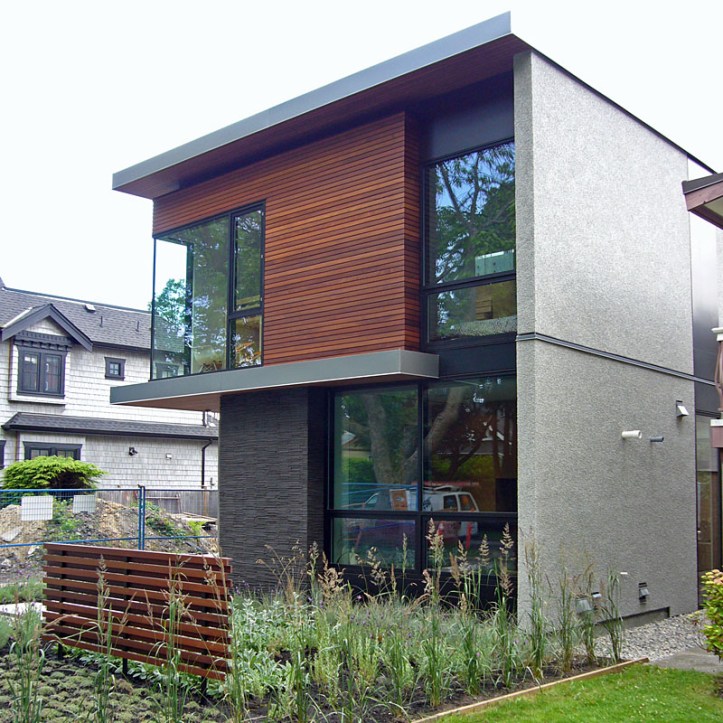this house was designed by evoke international design. awesome! this house sure is awesome. the few things that i love about this house is its simplicity in massing and the use of materials. simple gray stucco with nice large south-facing windows which are not only great in view to the new front yard but will also be greatly beneficial in solar heat gains in the winter months. the front door is cool. i like the fact it is the same height as the porch which surely give a grand feeling when entering the house. there is no chance to make a great second first impression and this entry is not lacking in impressing the visitor or the home owner alike. the ultra-thin stone veneer is quite a nice touch point at the entry and used sparingly in the facade helps the house not feel too heavy.