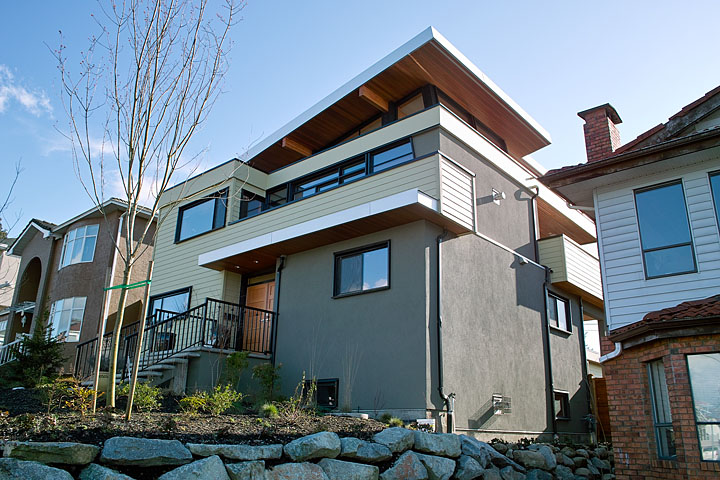 located on the very edge of vancouver (just a block from boundary), is a fine example of modern home that really works with the topography of the site. Looking at the context, the majority of the homes completely disregard their orientation either to the sun or the views. this house was more thoughtfully-designed with large overhangs and clerestory windows for natural light and views to the north.