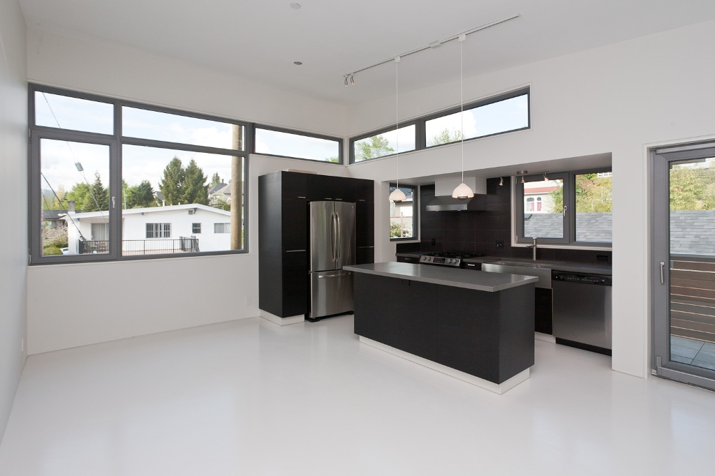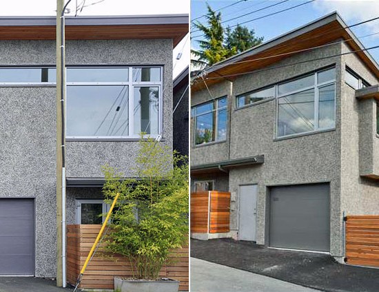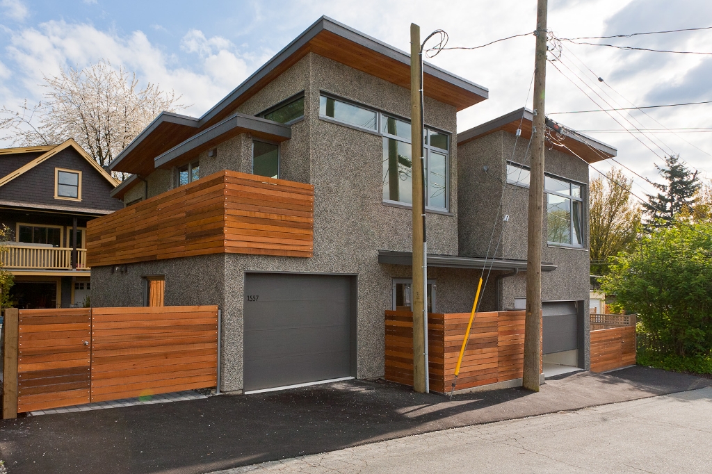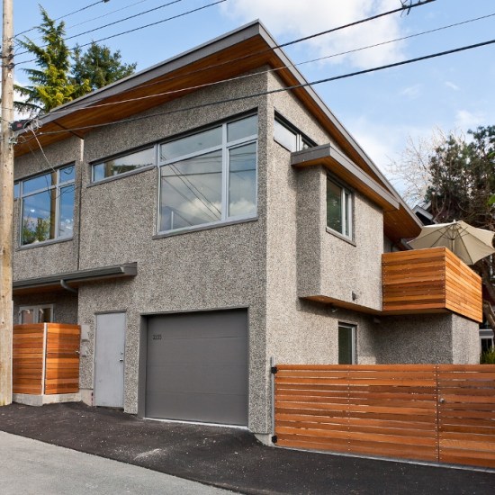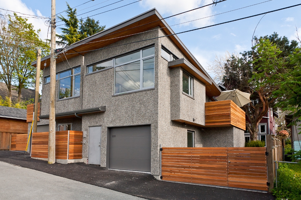 excellent design & craftsmanship by dwell development ltd. these bright duplex coach houses were built to “wow”. upstairs has an open floor with kitchen/dining/living & walk out cedar railed deck. it has 2 bedrooms on the main & a heated garage with window that could be converted to a 3rd bedroom. unique features are tilt & turn euro-designed windows, radiant white mapei concrete floors, dual boiler/hot water heater, douglas fir staircase with 12mm glass rails. also vaulted ceilings, stainless appliances, 6′ island counter in kitchen, double apron sink, quartz counters, customizing bedroom closets.