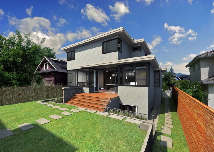 a rendering of the back of the house and the southern elevation. nice use of glazing on the ground floor facing the backyard. this will be good for all those cloudy days we get in the fall and winter. the upper floor overhang should be a bit longer. as you can even see by this rendering, if this is mid summer (july-sept), then there is too much direct sun entering the upper floor windows (the shadow should extend to the bottom of window sill.) i am not to crazy about the central landing an stairs cutting the yard down the middle with the walkway. perhaps the designer could relocate to one side to allow from better programming of the yard space?