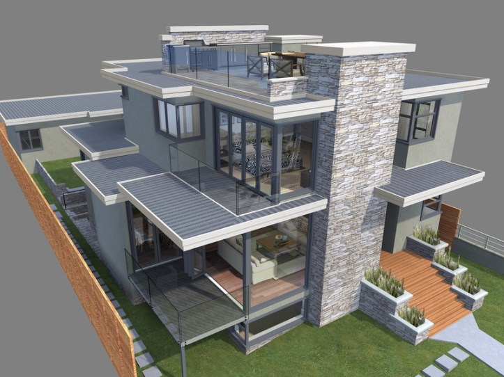 above is a rendering of the proposed house from the street. to keep the front fenestration of the house from being over-sized and completely exposed, the use of a grounding and solid feature, being the stone chimney, is used. This element also breaks up the elevation quite nicely. A nice use of corner doors and windows allows those views to come into the house. this being the north side of the house, the roof overhangs are kept to a minimum to allow as much soft indirect light into the space. the covered entry has the benefit of being next to he chimney element hence allowing the stone feature naturally be part of the porch and entry beyond (i hope – we shall see once we take a look at the floor plans further.) having flat roofs naturally leads to having roof top decks. it looks like that is the way to go as this site has quite a stunning view.