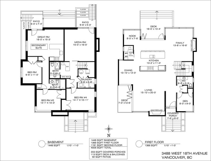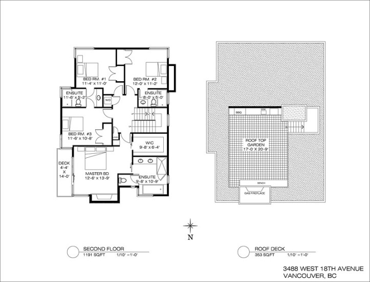 above is the upper floor plans. nice roof deck access from second floor stairs. i wonder where the door from inside to outside is? having the stairs exposed to weather will be interesting and a good challenge for the builder to maintain waterproofed. do you really think the homeowners are going to travel up and down those stairs with meat for bbq-ing?