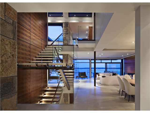 view from entry foyer looking towards the dining and living spaces to the south. on the left, are open-riser stairs connecting to other levels in the house. continuation of exterior stone cladding brought into the house, for connection with site.