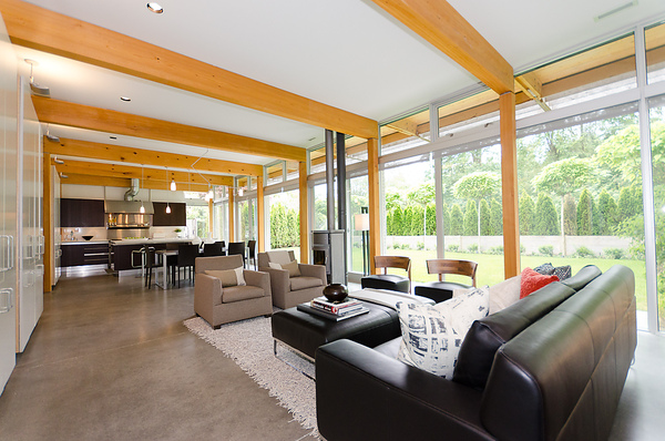 living room looking towards the kitchen. the post and beam structure is built within the building thermal envelope to reduce thermal bridges and therefore reduces energy demand. very well crafted details keep this house from being visually cluttered.