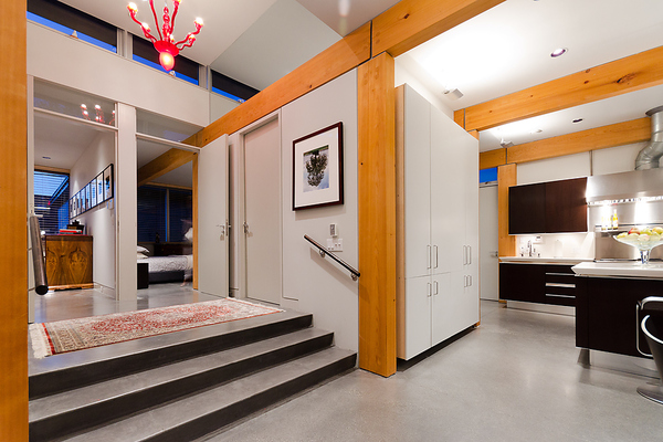 entry to bedrooms from living area. post and beam structure with clerestory windows allows light to enter from all directions during the day.