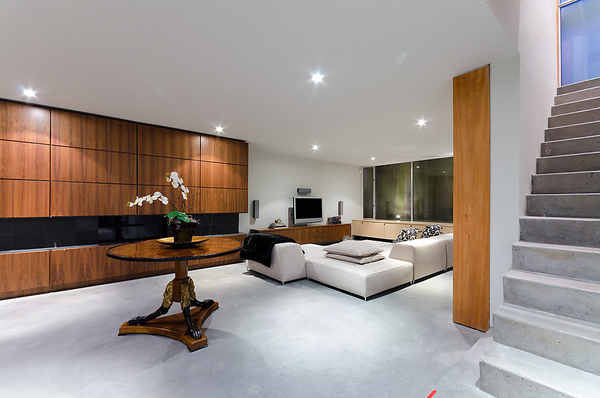 view of the basement recreation room with built-in cabinetry. cast-in-place concrete stairs lead to the main floor above.