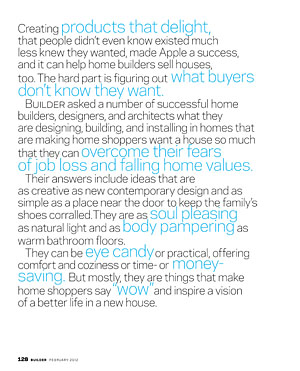 March 1, 2012February 25, 2012 david “A lot of times, people don’t know what they want until you show it to them” -Steve Jobs An article published in the February 2012 issue of Builder magazine about ‘what buyers don’t know they want.’ Share this: Click to share on X (Opens in new window) X Click to email a link to a friend (Opens in new window) Email Click to share on Facebook (Opens in new window) Facebook Click to share on LinkedIn (Opens in new window) LinkedIn Click to share on Pinterest (Opens in new window) Pinterest Like Loading...