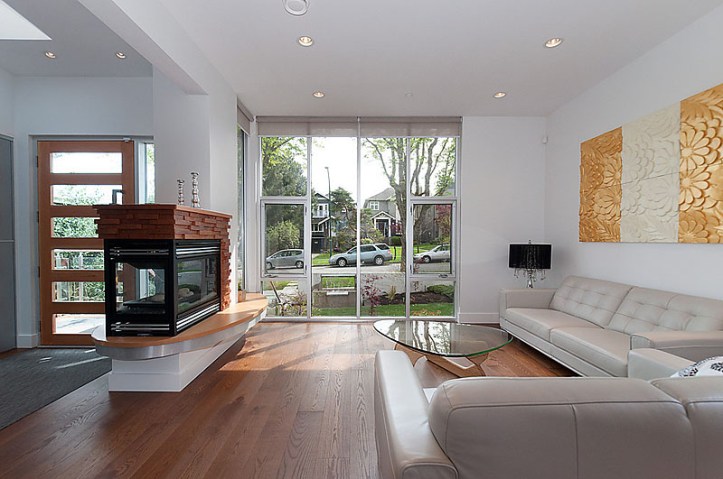 the living room looking south. a three-sided fireplace will keep the house warm. and provide a visual break from the entry to the living space. a large south-facing window will provide not only ample sunlight but solar heat gains during the winter months reducing the need for artificial heating.