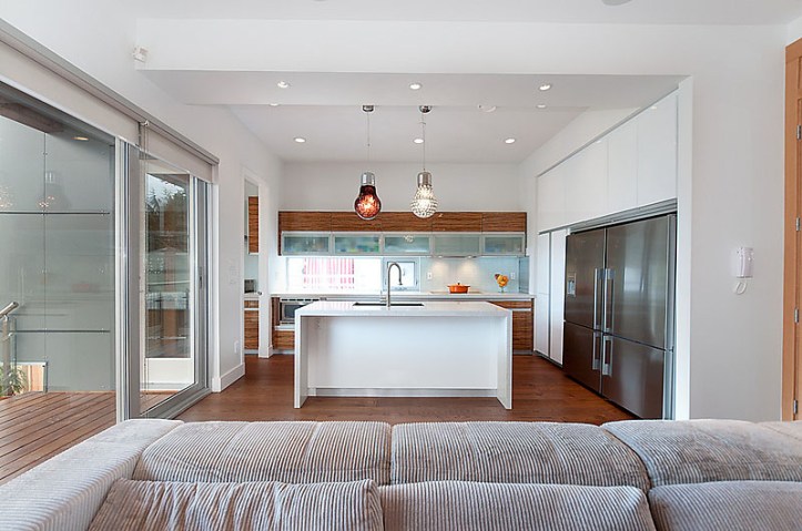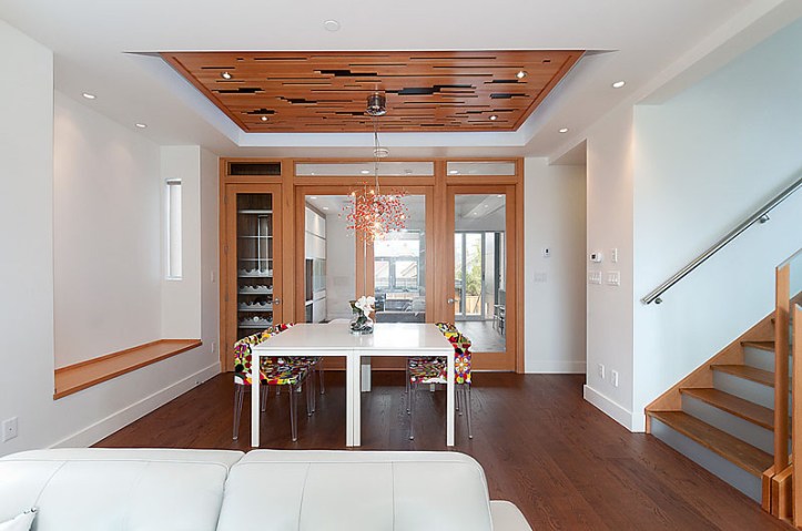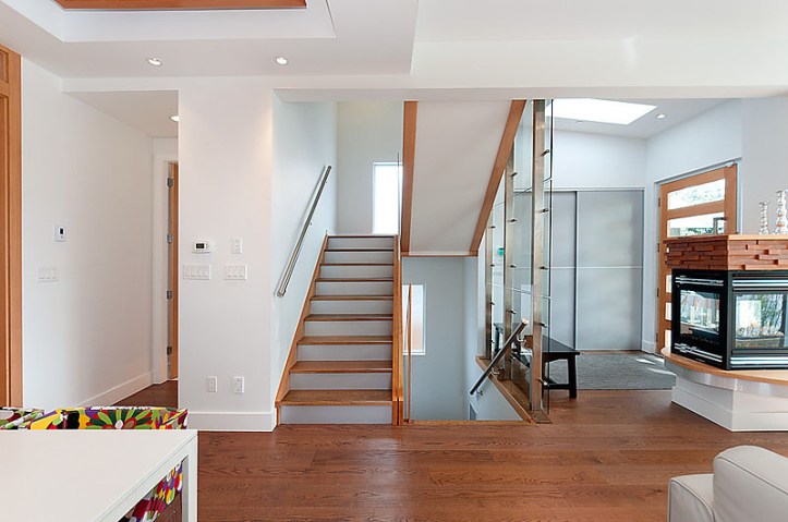 the main stairs leading up to the bedrooms on the upper floor and down to the basement. a glass partition between the entry and the stairs ensures natural light continues to invade deep into the house. the passage on the left is for the powder room, which also serves as a buffer between main eating area and the washroom. (i hope they put insulation in the wall separating the 2 rooms for extra sounds isolation). simple stainless steel tube handrail maintains the modern esthetic.