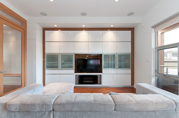 the family room viewed from the couch. fireplace, tv, storage built to one seamless piece of millwork.