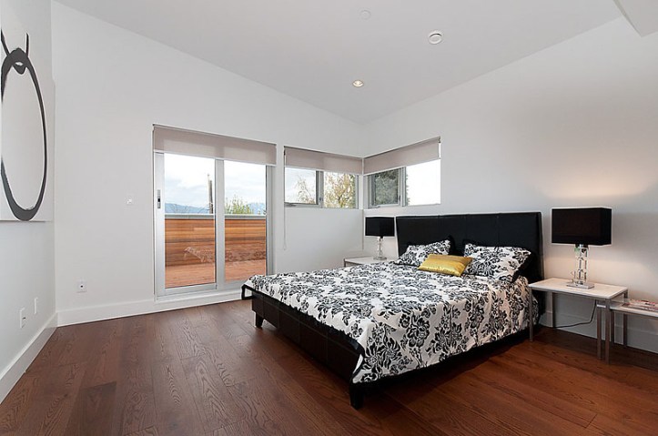 the main bedroom has access to private deck overlooking the backyard. the wall designed windows at the corner ensure furniture (headboard) do not conflict.