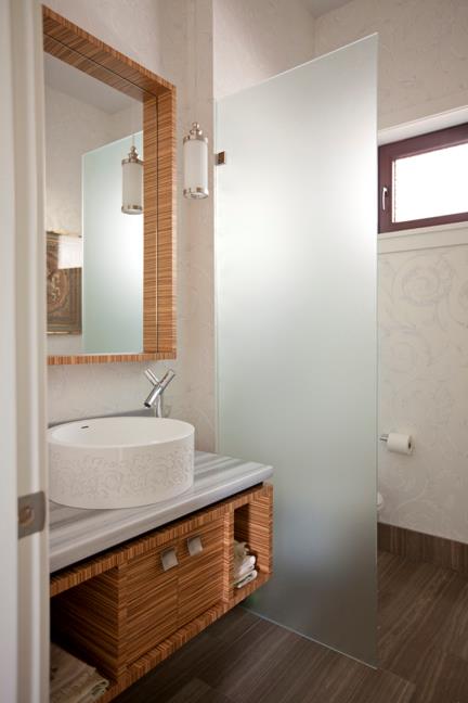 bathrooms all have a varying feel. frosted glass partition separates the toilet from the vanity and a free-standing soaker tub next to the window offers a relaxing atmosphere after a hard day of work. nice detail along the baseboard by implementing the same material as the floor tile and using marble floor and wall finish encapsulates the bathtub area.
