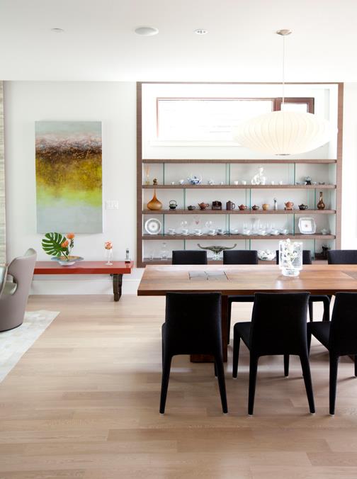 the dining room has built-in display shelves with high window above for indirect natural light.