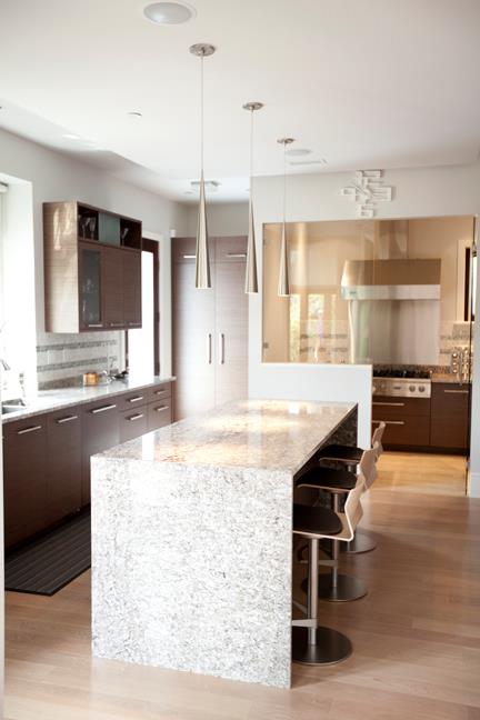 The kitchen features a striking ‘warp-around’ granite island. the wood flooring in continuous throughout the ground floor to increase vials openness and seamless connection of the spaces.