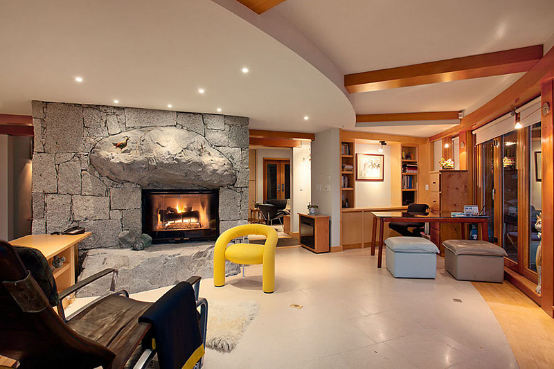 up a flight of stairs is the sitting room with another stone fireplace and built in rounded ‘couch’ and again that view dominates the space.
