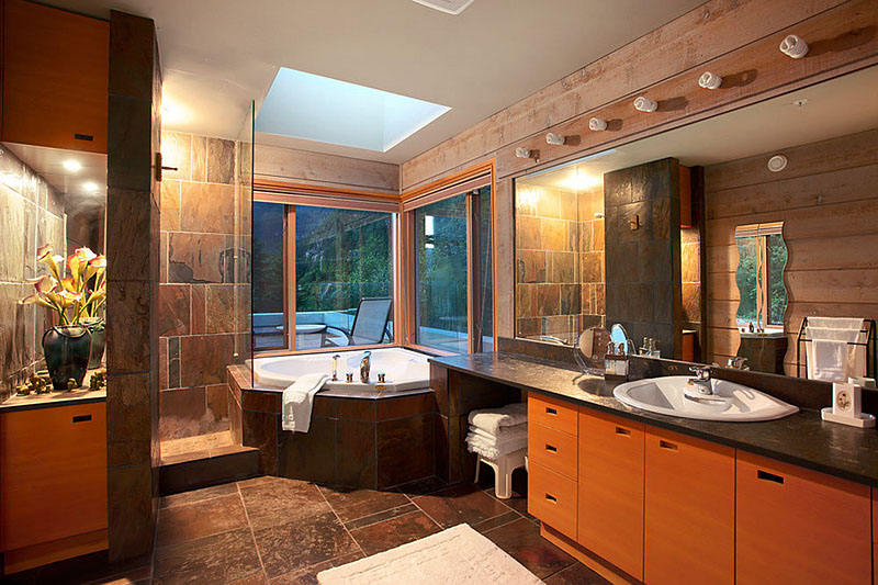 the master bathroom has stone tile throughout. generous corner window at bathtub with a view and if that was not enough look up and stare at the stars! yowza.