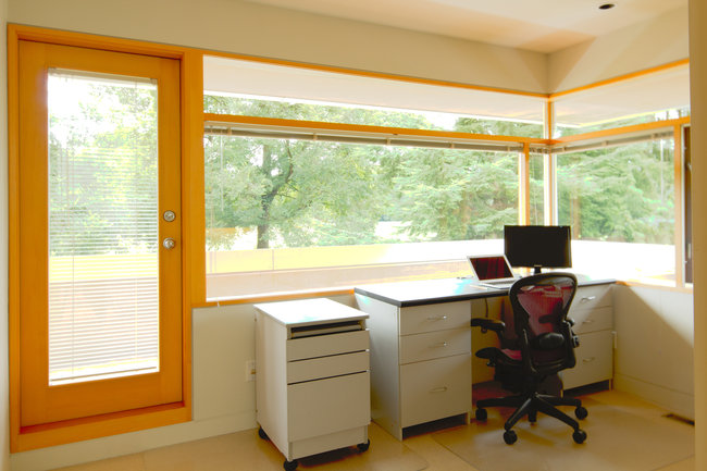 the office area allows abundance of natural light due to west-facing wrap-around deck adjoining the space.