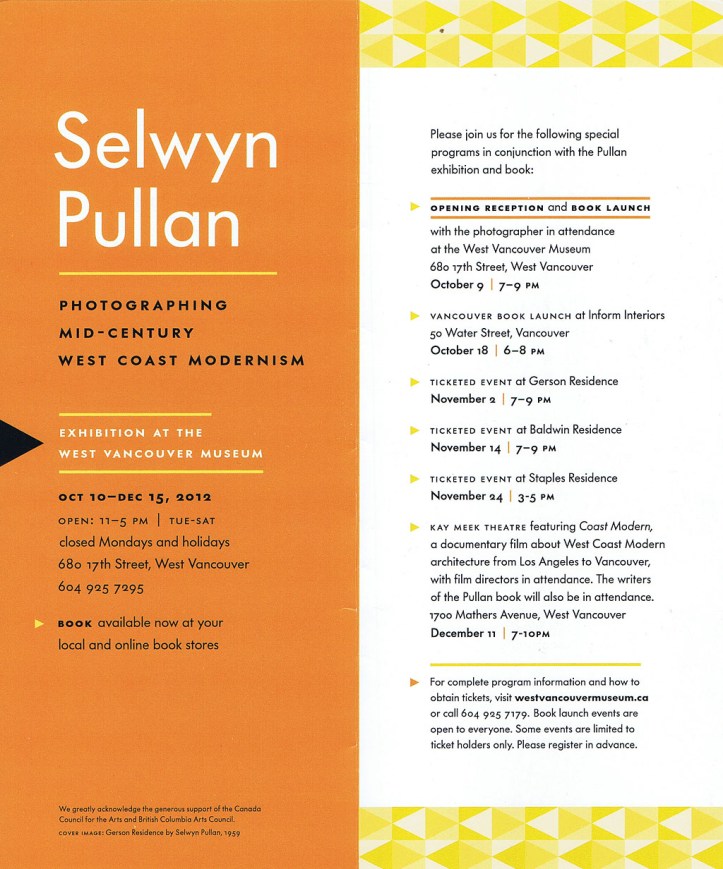 The West Vancouver Museum is pleased to announce a publication of Selwyn Pullan: Photographing Mid-Century West Coast Modernism and the museum’s second exhibition featuring the work of critically acclaimed photographer Selwyn Pullan this fall.