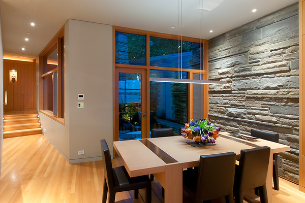 stone feature walls throughout the house that connect to the hard landscaping just beyond the wall of glass. well prepared and organized electrical/home controls keep the wall acne down to a minimum.