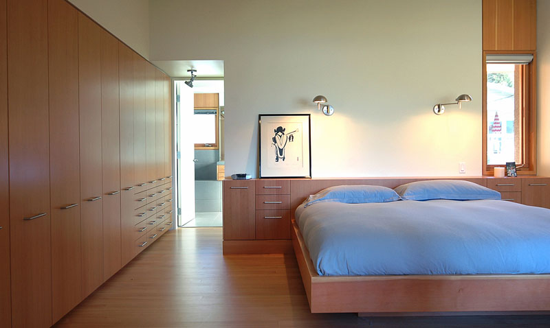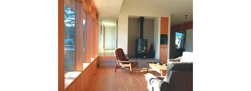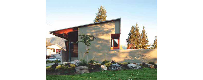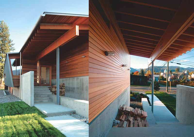 Good design moves here begin with the house’s siting on a small, west-facing lot on the geologically active banks of the surging Columbia River. The rectangular house has its long side facing the setting sun – so rectangular and modest in scale that a local joked, “Oh, you mean that fancy trailer?” when directing me to “Doc Battersby’s new place.” Indeed, across the river are trailers, and across the street are stuccoed former motel units with the same logical one-way slope away from the river. The simple reality is that shifting sandy soils and a sometimes-torrential river means snow shed off roofs needs to be deposited as far as possible from the Columbia’s changeable banks.