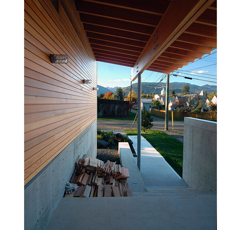 The trailer jibe may also have to do with the fact the Battersby house – co-designed by their Vancouver-based son David – is more metallic than woodsy, in sharp contrast to the loggy mock-Whistler houses newly arrived in town along with such other symptoms of resort mania as cedar-shake roofs – both less functional and more expensive than metal cappings. The David Battersby and Heather Howat design makes innovative use of a local vernacular building design element appropriate to this extreme snow zone town – standing seam metal roofs – then situates this material in an unexpected way.