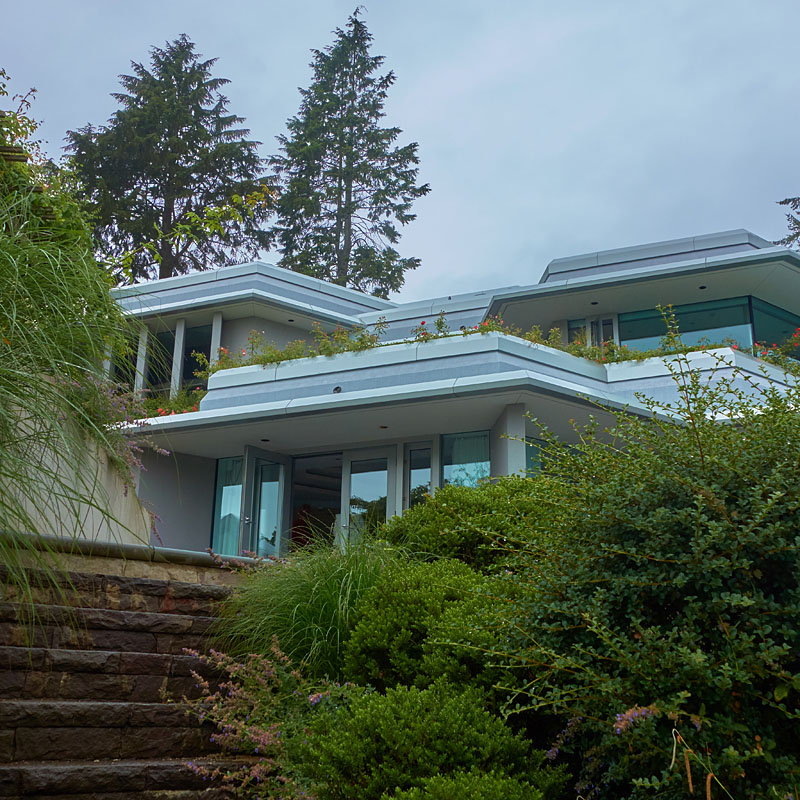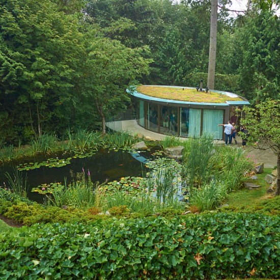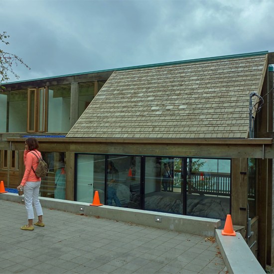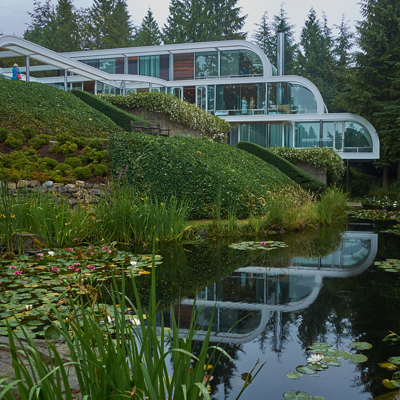 The 2014 Hugo Eppich Studio, designed by Nick Milkovich Architects, echoes the forms of the main house, an architectural wonder in its own right (Arthur Erickson, 1988), as well as the surrounding landscape, which includes a majestic natural reflecting pond. The studio’s landscaped roof, dark-coloured glazed frames, and stainless steel cladding contrast the white steel structure of the main house, making it a beautiful addition and a peaceful spot for contemplation. The main floor of Erickson’s Eppich Residence is also open to visit.