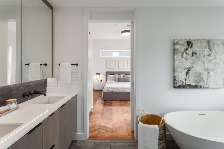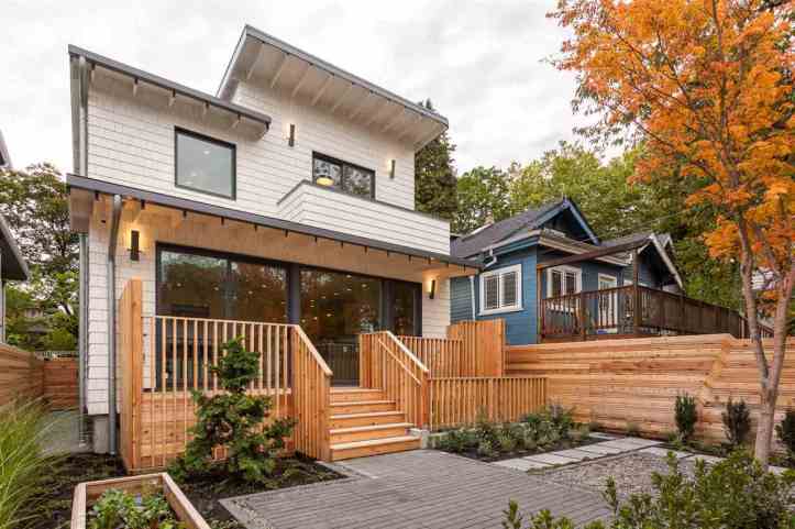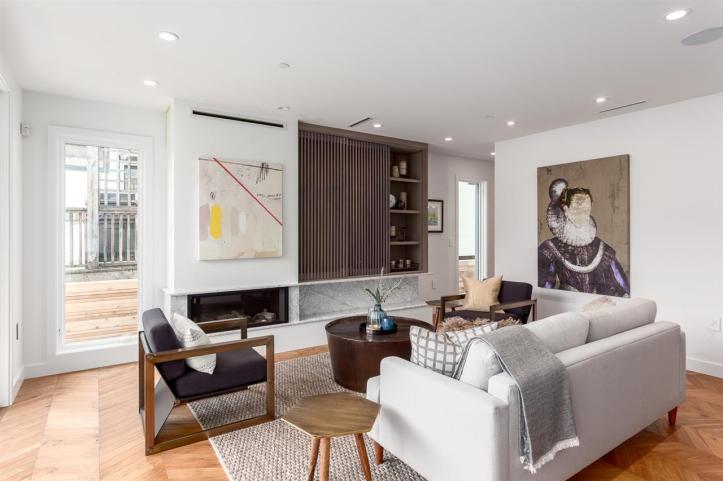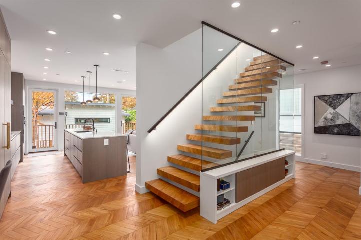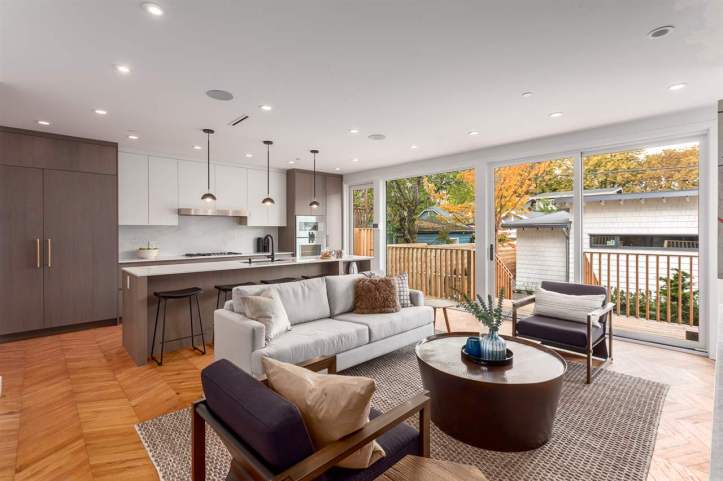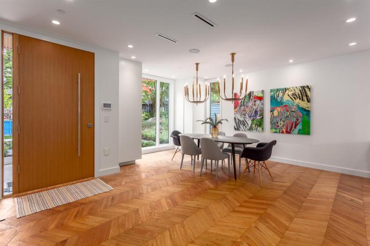 this modern nrt development home sits on a beautiful tree-lined street in the heart of kits. the open concept main floor is highlighted by the stunning chevron floors and a beautiful glass enclosed staircase with floating oak treads. the state of the art kitchen has a full gaggenau appliance pkg, an oversized 5 burner cooktop, and an abundance of storage. the efficient upstairs plan, allows for 3 en-suited bedrooms, generous sized bathrooms, and a good amount of closet space. downstairs you will find a theatre room/bedroom, large laundry room and guest suite with separate entrance. the energy star certified home features, top of the line insulation, air con, speakers, security camera system, and a beautiful japanese garden