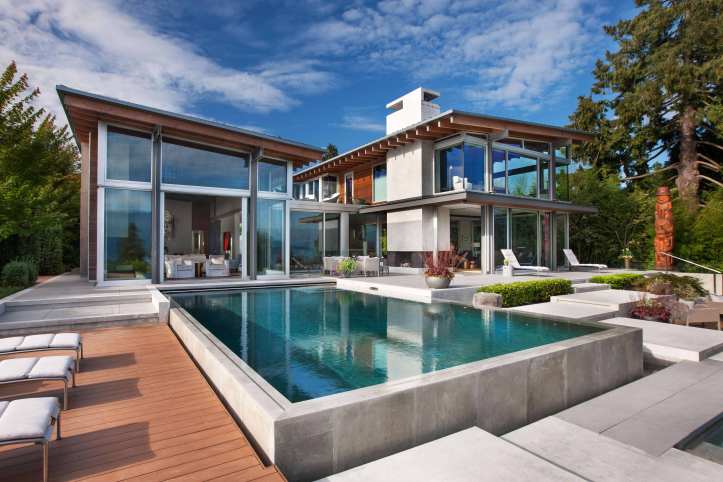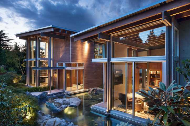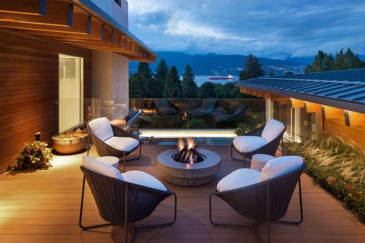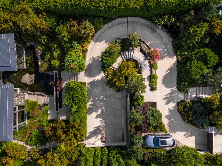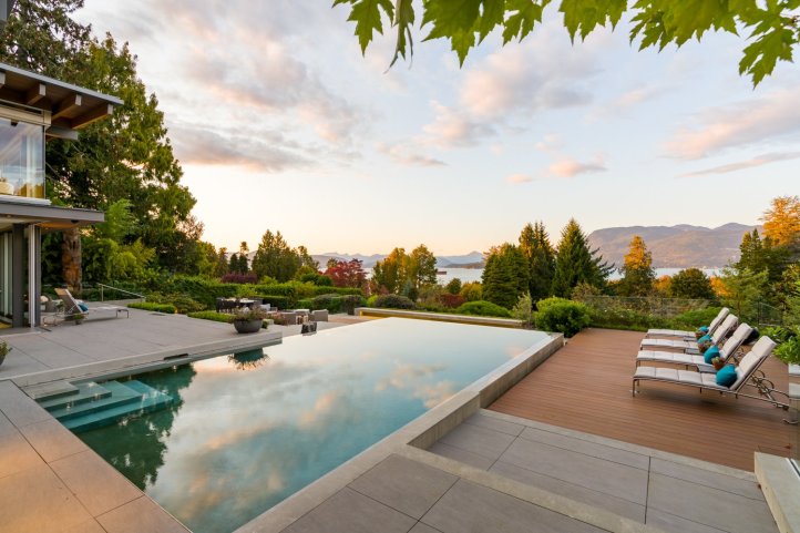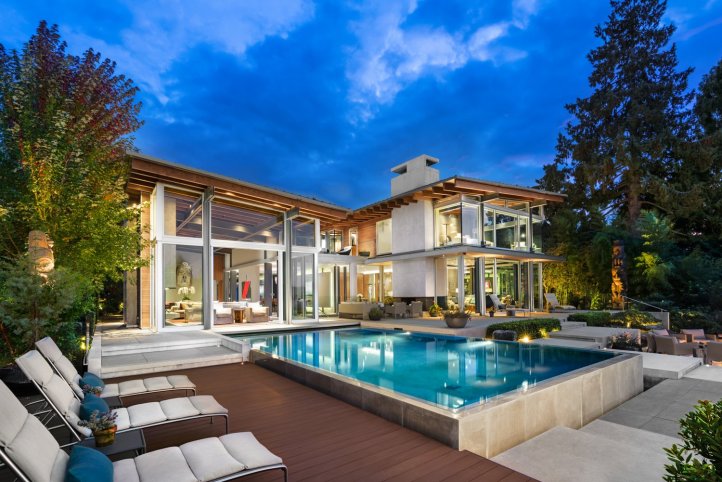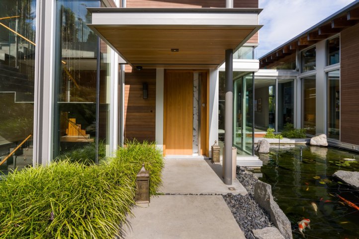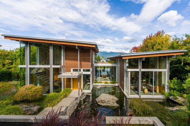 pacific spirit estate – this exquisite 0.7-acre ocean-view property overlooking english bay and the north shore mountains was conceived as something completely different – a contemporary home ideal for entertaining, yet also family oriented to cater for children. garret cord werner architects exceeded the owners’ vision, taking a holistic approach to simultaneously integrate the architecture, landscape, and design. the property is constructed from two pavilion-like components connected by a central dining area, creating visual junctures designed for contemplation. one of the highlights of the garden, which features native plants and natural sculptural stone arrangements, is a waterfall that cascades into the koi pond at the entrance way to the home, where the floating staircase can be glimpsed rising to the second level. simplicity reigns throughout, yet it is a warm, child-friendly, and wonderfully entertaining home – simply perfection.